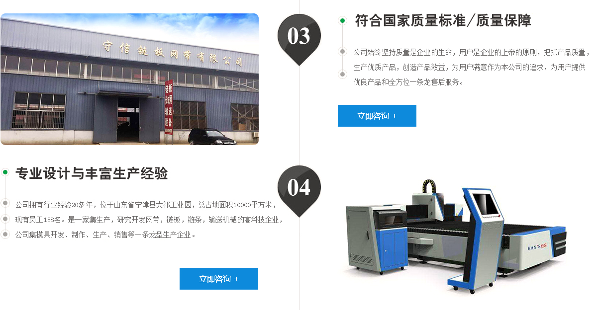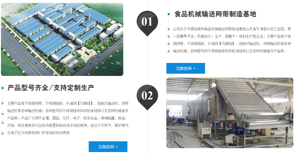 寧津縣守信鏈板網帶有限公司是中國包裝和食品機械輸送網帶制造基地,位于山東省寧津縣大祁工業園,是一家磨具開發,機械設計;生產、銷售于一體的生產型企業。主要產品有不銹鋼網帶、不銹鋼鏈板、長城網【馬蹄鏈】、鏈板式輸送機、網帶輸送機等各種輸送機 械;各種型號的不銹鋼鏈條和非標準鏈條以及各種機械備件產品等。產品廣泛用于金屬、器皿、化纖、電子、粉末冶金、玻璃瓶罐、食品、燈炮、熱處理等各行業自動裝置和自動流水線的使用,適合于天然氣、焦爐煤氣及電子紅外線等各種窯爐系統的傳動使用,本廠始 終堅持質量是企業的生命,用戶是企業的上帝的原則,把抓產品質量,生產優質產品,創造產品效益,為用戶滿意作為本公司的追求,為用戶提供優良產品和全方位一條龍售后服務。...... 更多>>